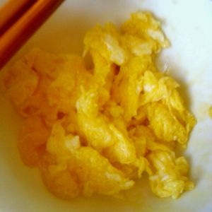 鸡蛋稍稍定型,锅里没有蛋液了就可以盛到碗里了,备用。