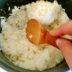 用饭铲或勺子的边把米饭像这样“刮”,这样把米饭弄弄散,待会方便炒匀。