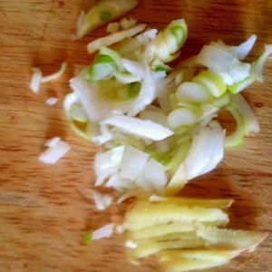 拿一小段葱,大葱小葱都可以,切成葱花。然后把姜切成姜丝,备用。