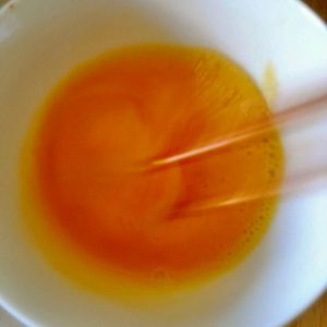 感觉油稍热了。把打散的鸡蛋液倒进锅。然后用筷子不停的搅,把鸡蛋搅散。