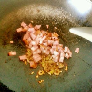 炒到闻到香味了,就可以把红肠丁倒进锅里。继续炒。