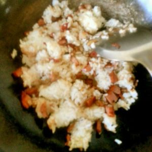 把香肠和葱姜炒匀了之后倒入米饭。吃多少米饭就炒多少。不停翻炒。如果感觉米饭有点成米团了就用铲子背面压,不要再切了,不然米饭就会稀烂掉。