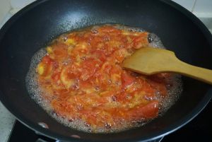 蕃茄入锅炒,炒到浓汁可以再加入蕃茄沙司,一起炒。