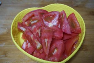 西红柿切片,土豆切丁,洋葱切片备用