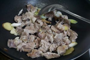 坐热炒锅,加入葱段姜片蒜片,八角翻炒,爆香后加入牛肉。