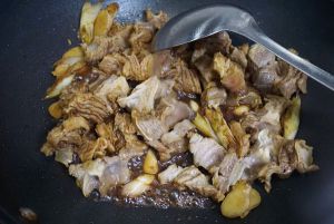 加入糖、酱油炒匀后,加入牛肉翻炒均匀,倒入热水没过牛肉,大火烧开后转中小火,炖煮40分钟;