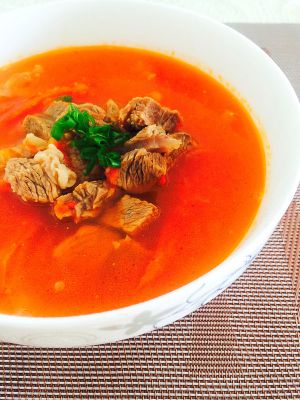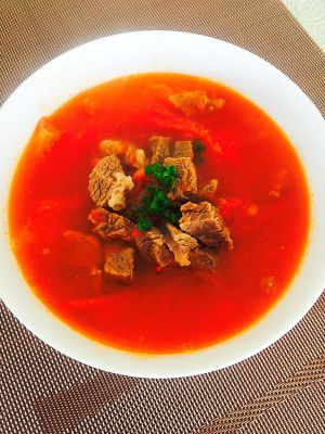 放油,葱姜蒜,花椒,爆香,放牛肉,然后放番茄,料酒,生抽,老抽,醋,糖,盐,鸡精,加水,放菜。