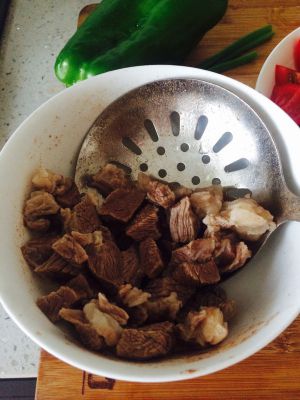 锅中入水烧沸后入牛腩、少许料酒、一小勺白醋、两片姜去腥 去杂质和别下浮末…略煮会就好,将牛肉捞出备用。水倒掉
