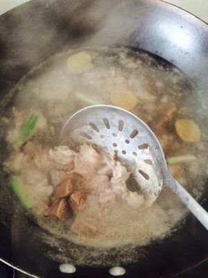 锅里放两片姜,葱,放牛肉进去,去除肉沫。