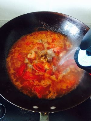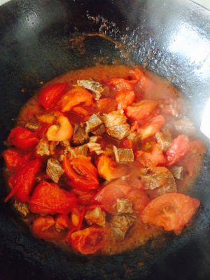 炒过得牛肉倒入清水熬煮,放入切好的土豆番茄