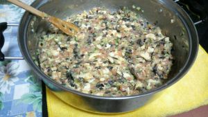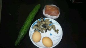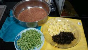 处理之后:1°猪肉剁成小块放入蚝油料酒盐糖酱油老抽 2°黄花去芯切丁 3°木耳鸡蛋切丁