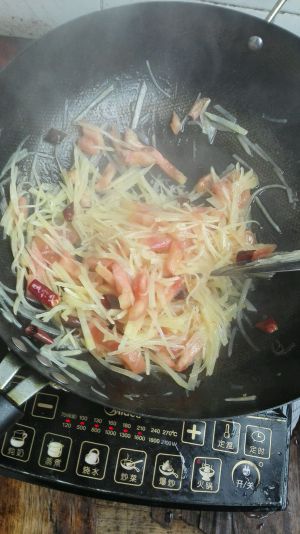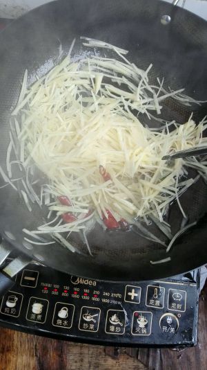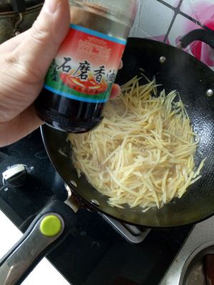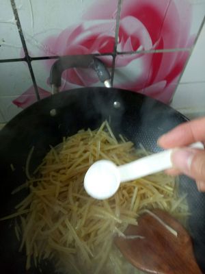 锅里放油烧热、放土豆丝翻炒、差不多熟了,在把土豆丝扒在锅一旁放入韭菜花炒一下、在两者并在一起炒几下、放佐料起锅。装盘。