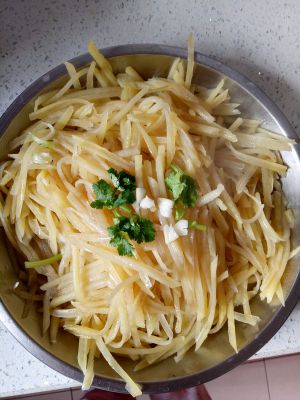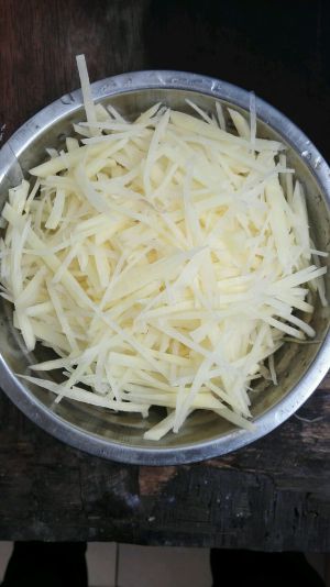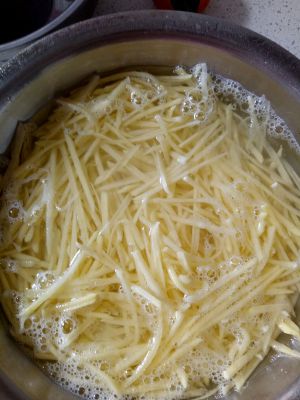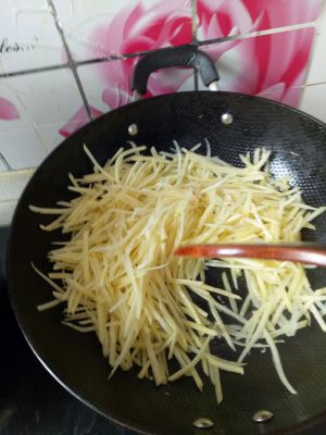 土豆切丝,用水掏过,沥干水分.韭菜花准备好