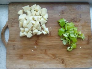 土豆、鸡肉(排骨)切块,葱段、姜片、蒜瓣备妥