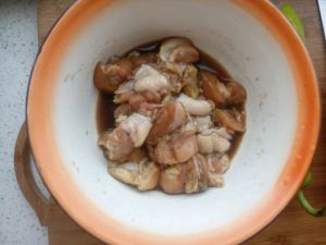 鸡肉切块,加料酒,生抽,鸡精,十三香,姜片腌制十五分钟