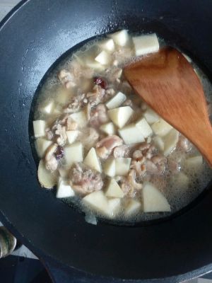 待鸡肉开始断生,放入土豆再次翻炒半分钟