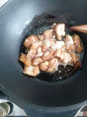 锅里放少许油,放入大料(也可以放干红辣椒,花椒之类的提香)待油热后放入腌好的鸡肉块煸炒