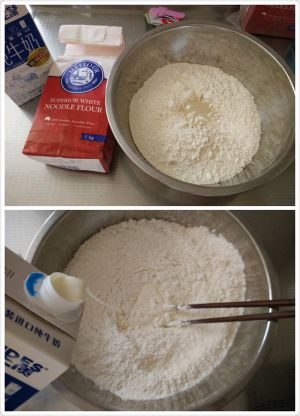 面粉放入盆中,加酵母粉混合均匀,边倒牛奶边用筷子搅拌。