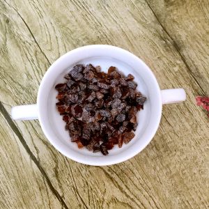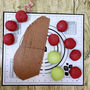 红色面团里面均匀的包裹一些提子干,放入绿色的面皮里面。