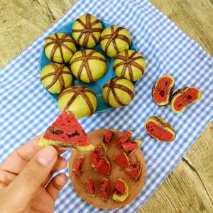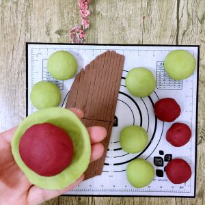 将绿色的收口,然后巧克力色的方形条交错放在绿色圆形面团上面。小西瓜就做好了。
