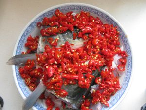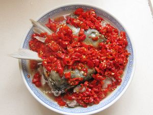 腌好的鱼头平放在盘子里,把剁椒盖在上面,根据鱼头大小上火蒸12-15分钟。