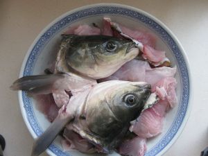鱼头清洗干净,放入大碗里,还有少许的鱼肉,撒少许的白胡椒粉,腌渍片刻;