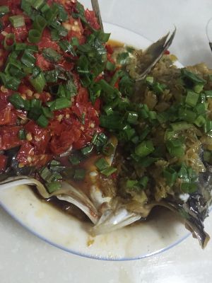炒好的蒸鱼料铺在鱼头上,起锅烧水开后,入锅蒸10分钟