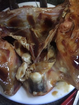 鱼头蒸好后,把里面的蒸鱼水和调料倒出清理干净。这是关键的一步,鱼头腥不腥就看水倒得干不干净。