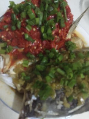 码好鱼头,剁椒覆盖一层(厚)在鱼头上,蒜末泡椒末,香葱段也码好备用。此时可倒入一点点生抽在上面。