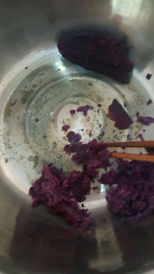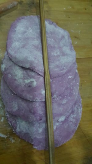 红薯面擀皮,然后这样用筷子压一下,卷起来。从中间切开。