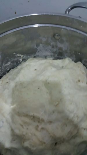 和面,一把耐心,一把牛力,直到3光(手光不黏手,不粘盆,面团光滑),当在有开水的电饭煲里(没有开电的,起到保温作用)直到面团发酵到原来的两倍大!