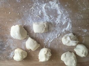 把揉好的面团放到案板上,分成10份,然后用手揉圆,把蒸笼上刷上一层油或是垫上笼布,把10个圆面团放进蒸笼里准备上锅。
