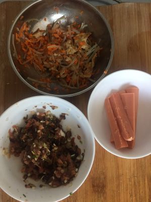 准备食材,火腿肠一根中间切开,切成6到8小根