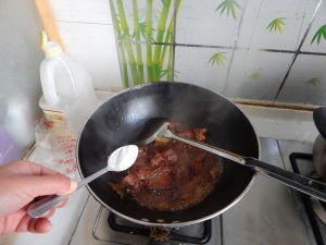 锅内放适量油,4成热时放入冰糖,慢慢融化。