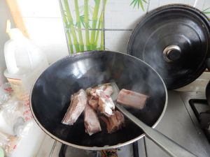 排骨凉水下锅,不盖锅盖煮开。用凉水是为了将排骨中的血水尽量煮出来, 不盖锅盖是为了让异味充分挥发。开锅后会慢慢煮出血沫子,将血沫尽量撇干净后,将排骨捞出备用。