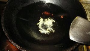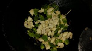 然后把鸡肉乘出来,放旁边,先把切好的辣椒大蒜放进去爆炒一下,然后把肉也放下去,和在一起,放盐,味精,少放一点鸡精,还有醋,这样就好了