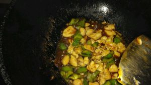 放入鸡丁 青红椒丁炒匀淋入麻油出锅即可