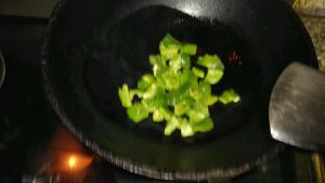 鸡丁煸炒变色放入柿子椒炒一分钟