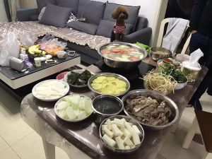 大火半小时后,中火慢熬一个小时,然后(因为我一个吃)就分了一半加入小锅开始涮菜啦