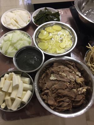 炖汤的时候准备配菜、你喜欢吃的菜一会烫着吃火锅一样的概念、准备蘸料、香菜葱、小米椒、最重要的是豆腐乳白味的腐乳是我们吃羊肉必备的调料、蒜根据个人口味喜好就调制。