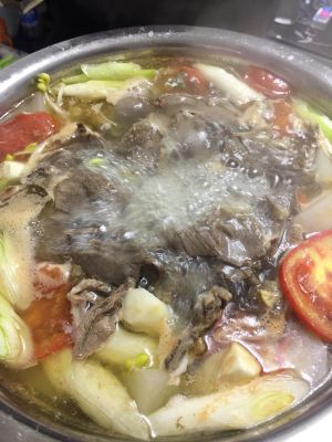 肉吃完后,放上电磁炉,将汤加热,放入你喜欢的素菜(萝卜,粉丝,豌豆尖儿……)