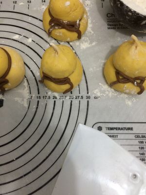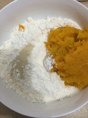 面粉里加酵母,白糖搅拌均匀,然后分次加入南瓜泥搅拌成絮状,然后揉成光滑的面团,因为南瓜泥本身水份很大,所以我就没额外加牛奶和水