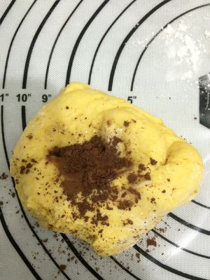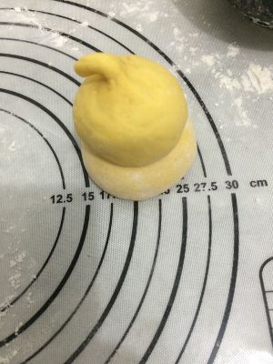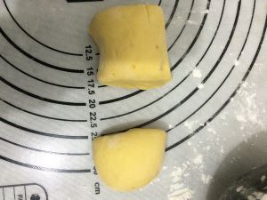 把南瓜面团分成8份,取其中一块面团分成大小两块