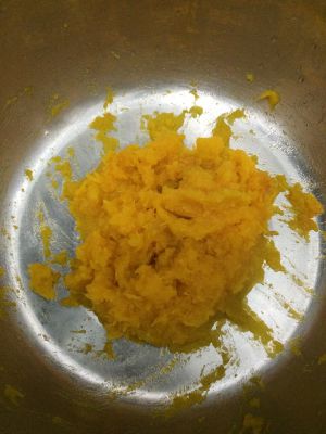 蒸熟的老南瓜水份挺大的,我倒了一些出来才开始压成泥的,南瓜泥放凉些再和面哦