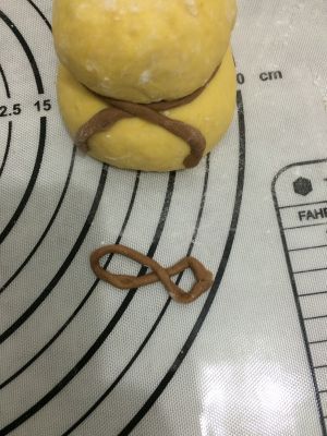 把可可粉的面团搓成长细条和小蝴蝶结,固定在葫芦上