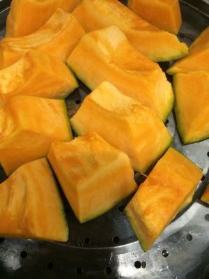 板栗南瓜洗净,切成小块,锅加入水烧开,把切好的南瓜放入,大火蒸十五分钟
