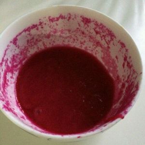 先把红心火龙果剥皮打成泥,过滤掉黑色的籽(不过滤掉黑色点点很丑哟)