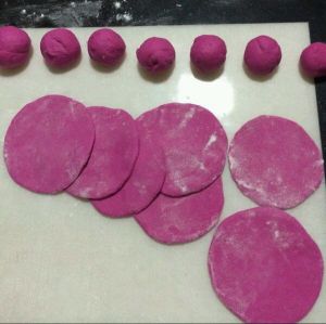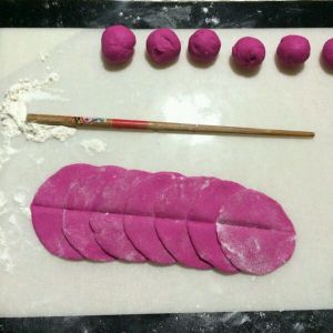 撒上些干粉,将剂子按扁,擀成直径7~8CM的圆片,圆片的边最好擀的薄点