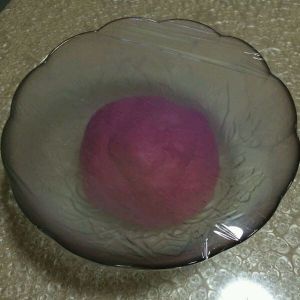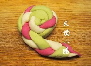 、取一份面粉加入发酵粉、适量糖,倒入火龙果汁,揉成面团,等待发酵;另取一份加入同样辅料,倒入菠菜汁揉成面团;再取一份揉成白色面团;