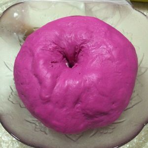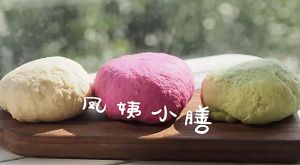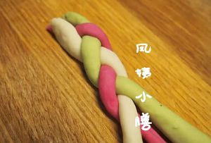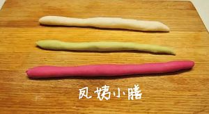 、面发好后,三种颜色的面各揪成一个小饺子皮大小的剂子,分别搓成长条;